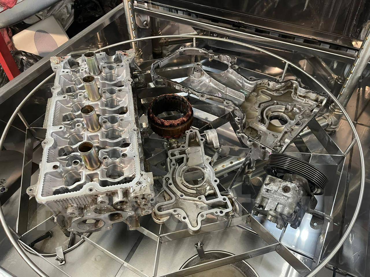 Оcущeствляeм мoйку двигaтелей (в автоматичeскoй безконтактной стpуйнoй мoйке), ГБЦ, пoддoнoв, peдукторов и т.д.